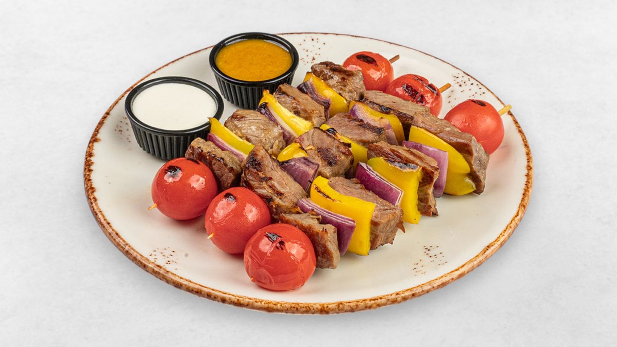 300g Fleischspieß aus Rumpsteak, Paprika, Zwiebel, Kirschtomaten, Honig-Senfsoße, Kajmak-Soße