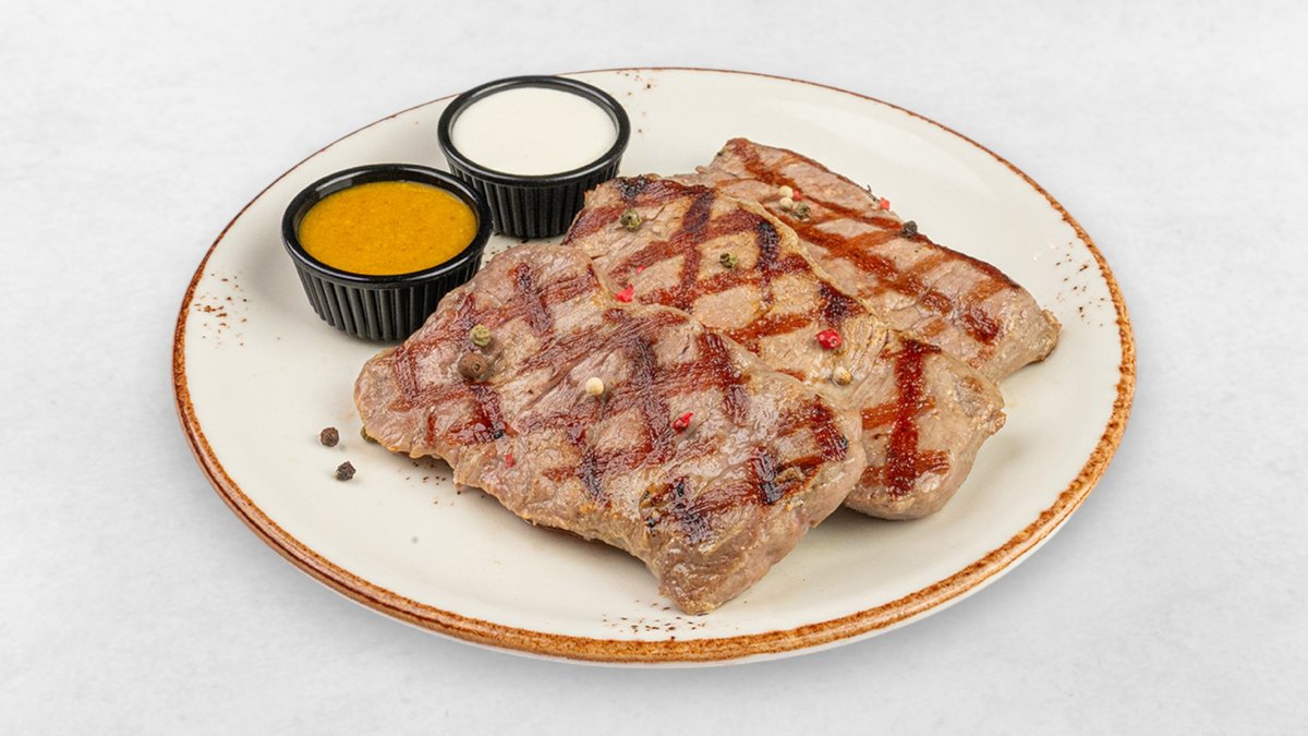 300g mariniertes Rindfleisch, Honig-Senfsoße, Kajmak-Soße