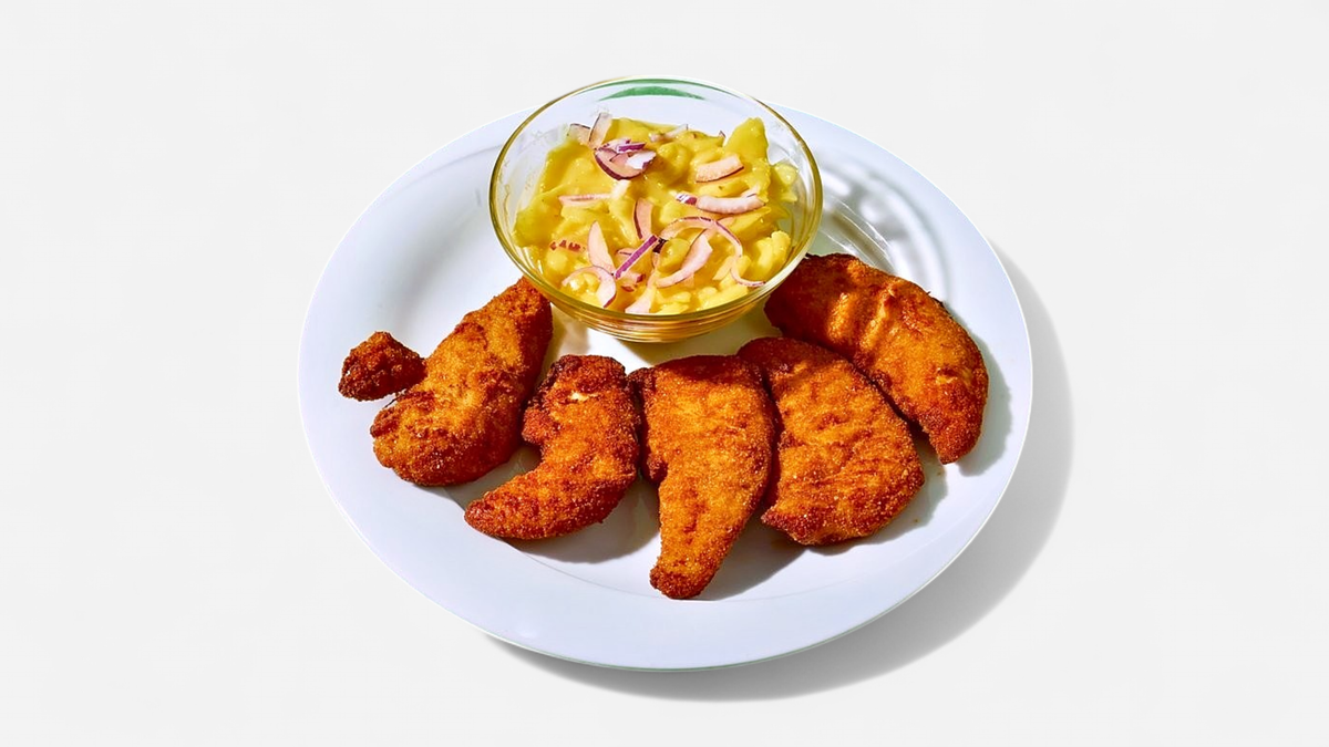 Ein Wiener Schnitzel vom Schwein, Huhn oder Puter, dünn geklopft, in knuspriger goldbrauner Panade ausgebacken – ein echter Klassiker der österreichischen Küche. Serviert mit Zitronenscheibe.