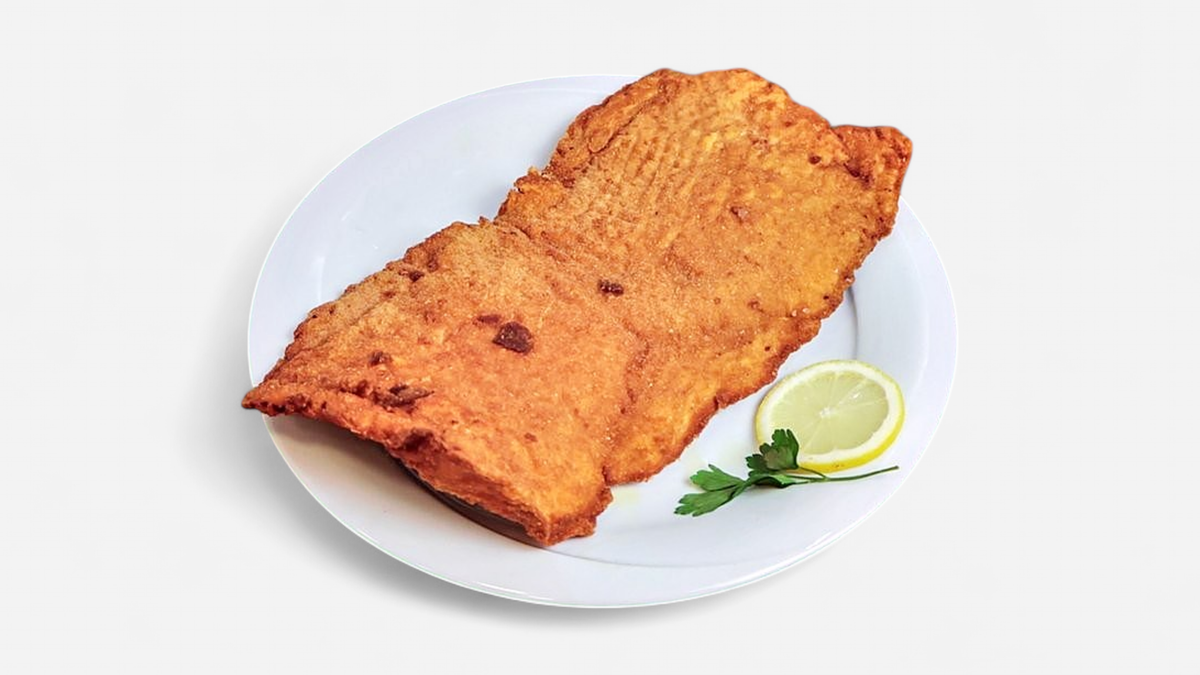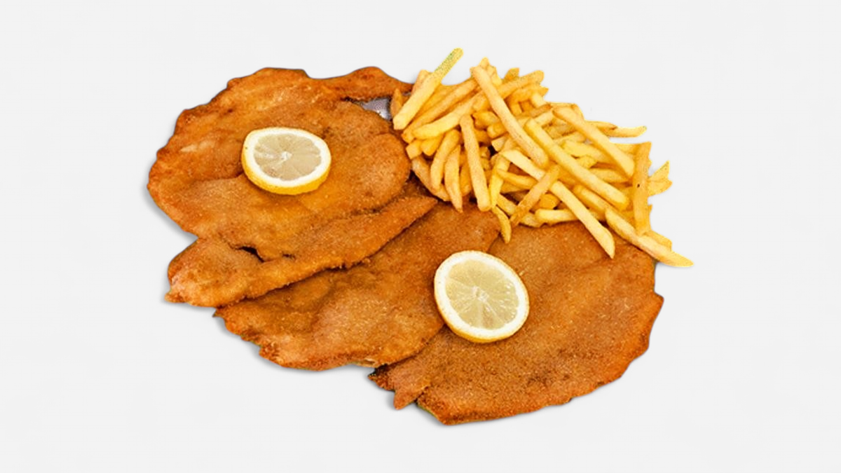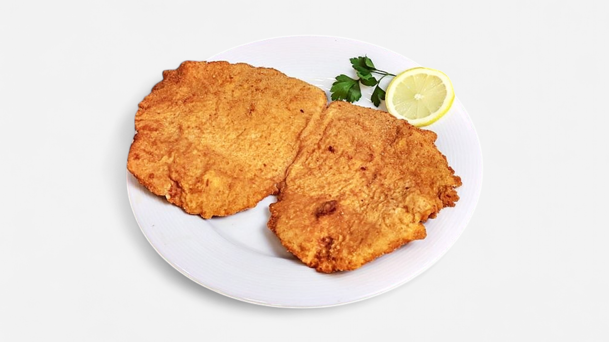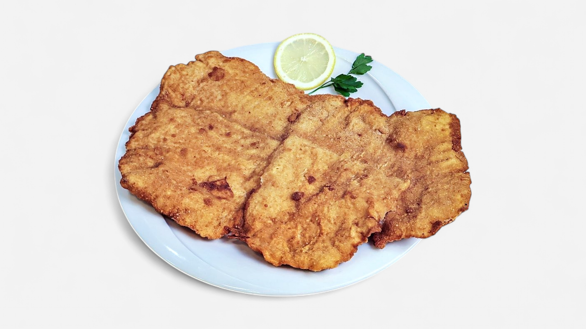Ein extra großes Wiener Schnitzel vom Schwein, Huhn oder Puter, dünn geklopft, in knuspriger goldbrauner Panade ausgebacken – ein echter Klassiker der österreichischen Küche. Serviert mit Zitronenscheibe.