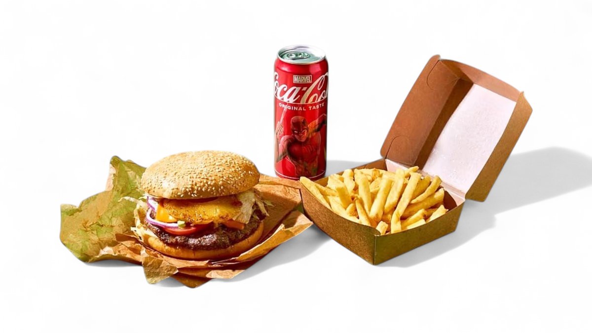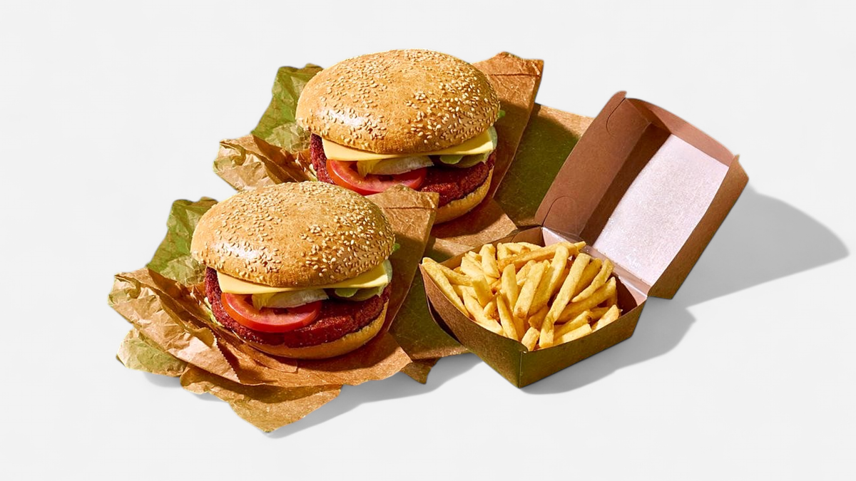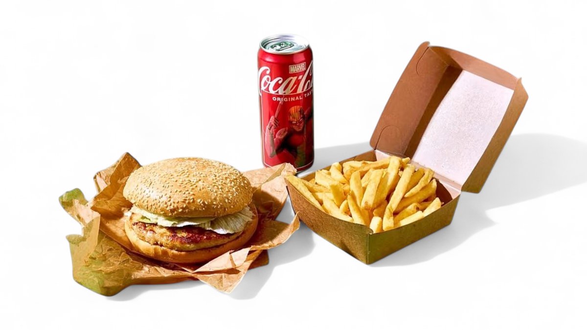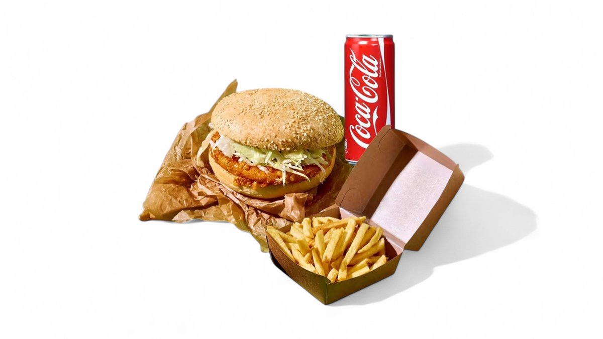 Leckerer Double Chicken Burger mit Pommes und 0.33l Getränk der Wahl