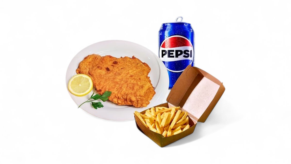 Schnitzel + Pommes + 0,5l Getränk (Huhn oder Schwein)