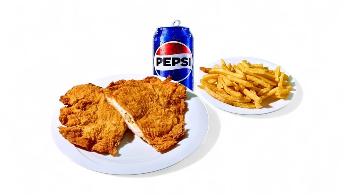 2 Schnitzel vom Huhn oder Schwein mit 2 Portionen Pommes & 2x 0.33l Getränke