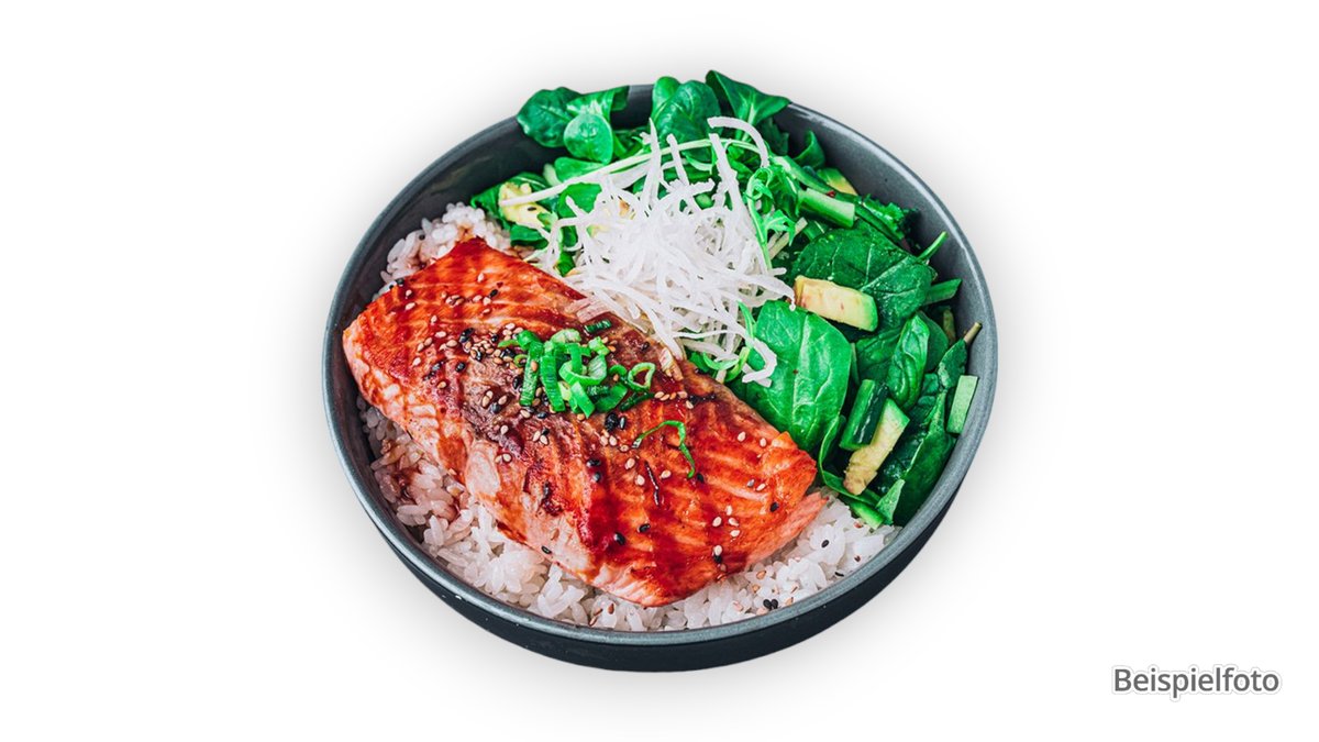 flambiertes Lachsfilet mit frischem Wok-Gemüse, Teriyaki-Soße und Reis