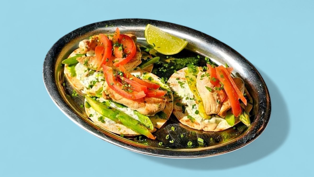 Drei leichte Lunch-Tacos mit Hähnchen, Spargel & Tzatziki Weiche Tortilla, saftiges gebratenes Hähnchen, grüner Spargel, frische Tomaten, cremiges Tzatziki, grünes Kräuteröl und frische Kräuter. Abgerundet mit einem Spritzer Limette.