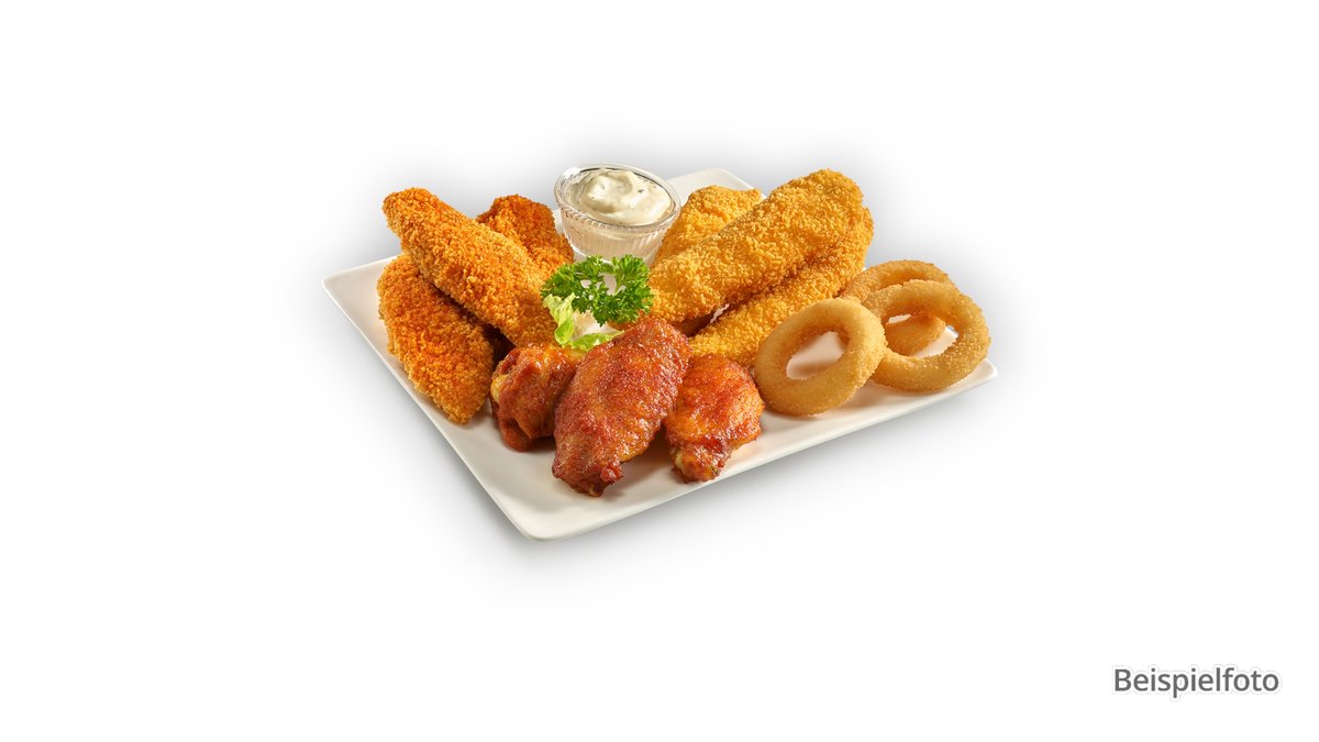 1x Chicken Wings 1x Chicken Nuggets 1x panierte Filetstreifen mit Pommes frites 3x Soße nach Wahl