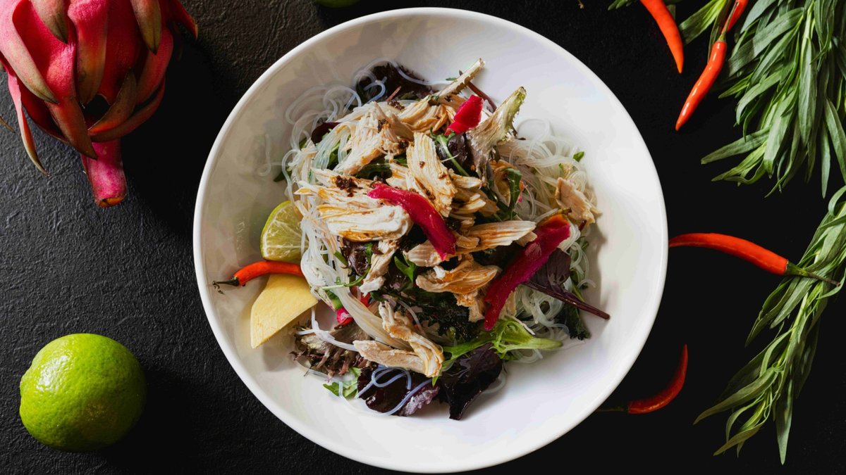 mit Koriander, Glasnudeln und pulled Chicken