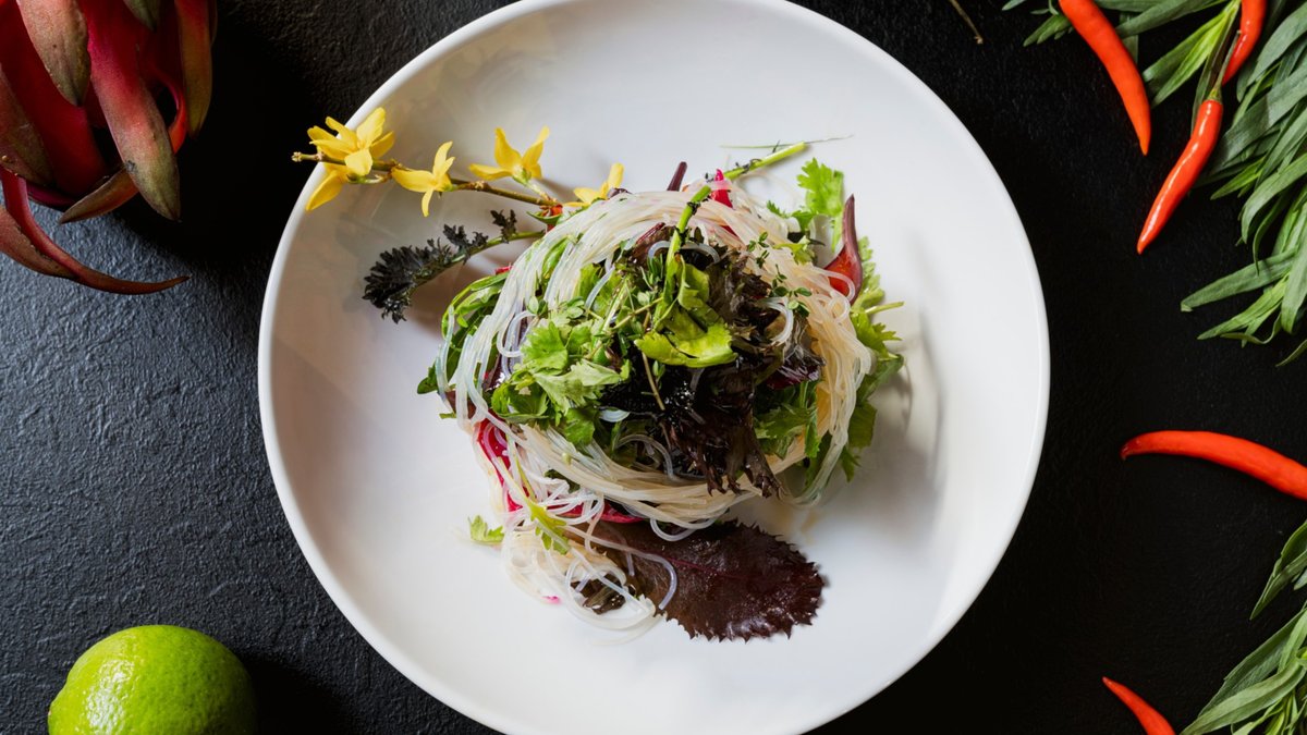 mit Glasnudeln, Koriander und geröstetem Sesam
