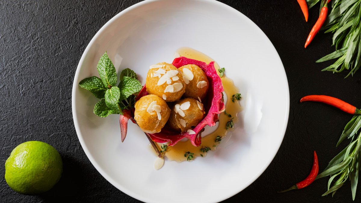 knusprig gebacken auf frischem Gemüse der Saison mit fruchtig-pikanter Mangosoße