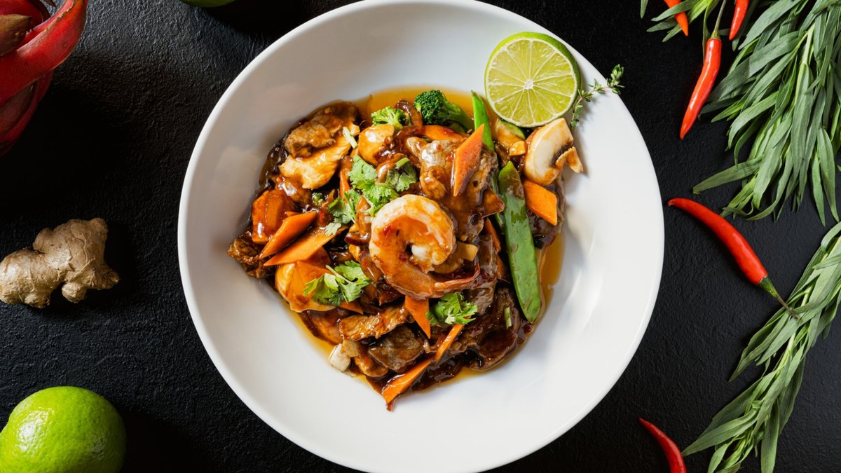 scharf 1 Stück Scampi, Rind-und Hühnerfleisch mit Gemüse
