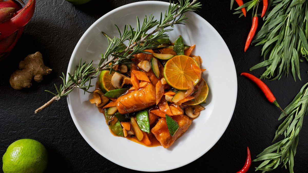 knusprig gebacken mit Gemüse und Süß-Sauer-Soße