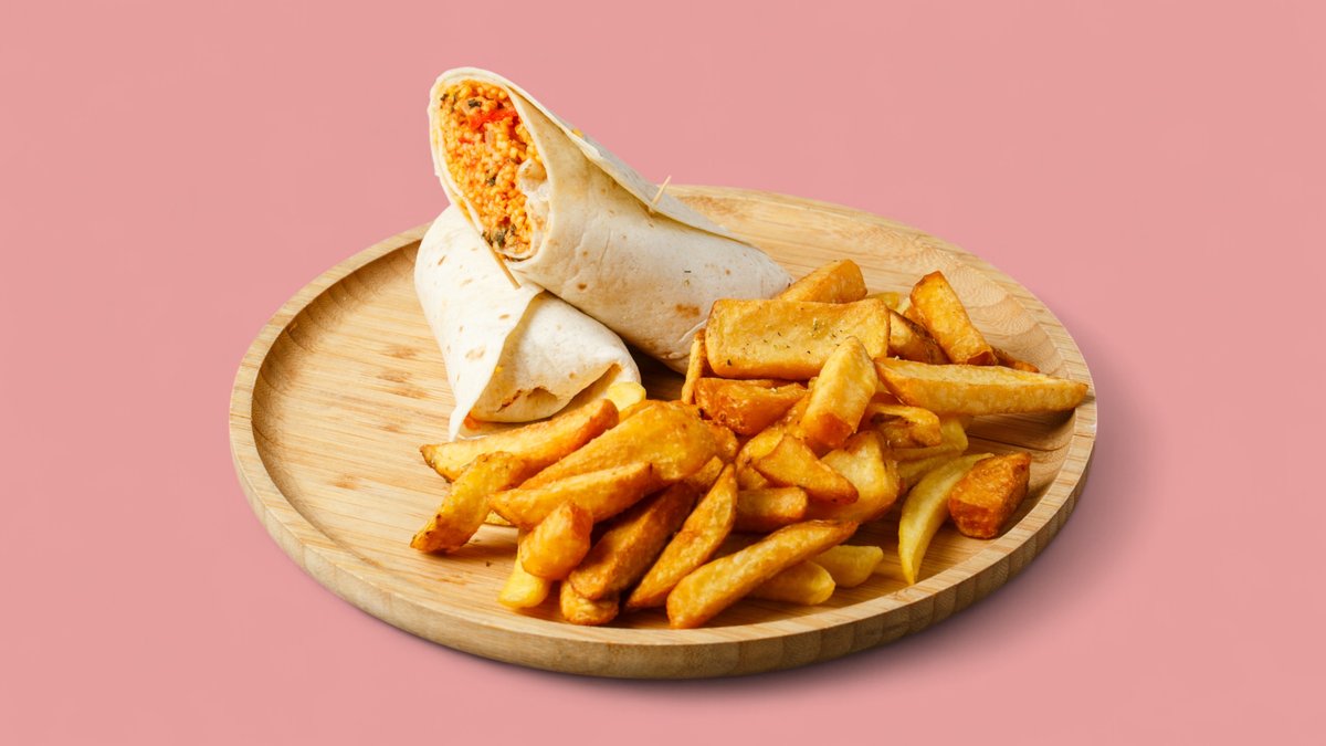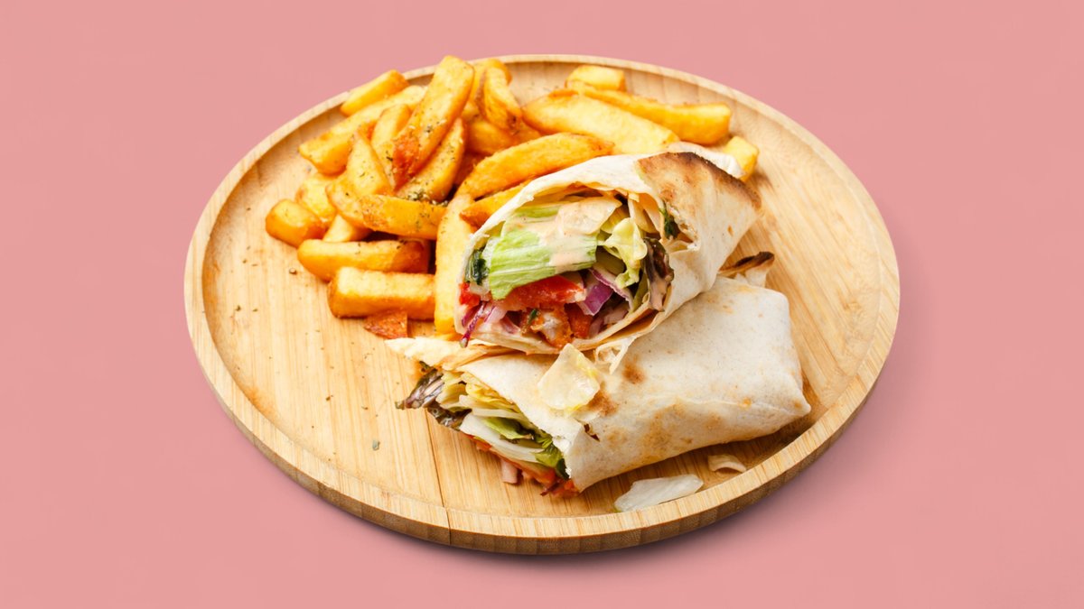 mit 2 Pita, Eisbergsalat, Tomaten, Zwiebeln, Cocktailsoße, Remoulade und Pommes frites