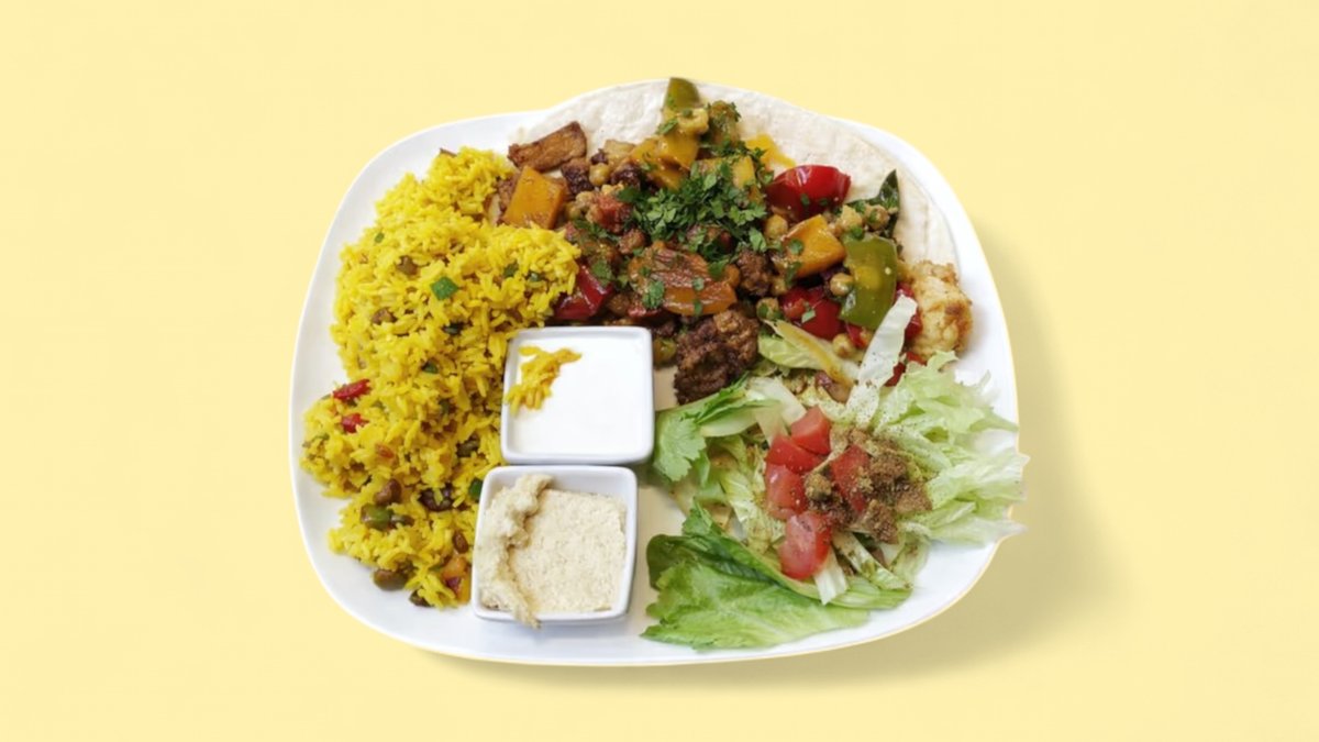 mit gebratenem Gemüse, dazu Salat, Hummus, Beirut Soße und einer Beilage deiner Wahl