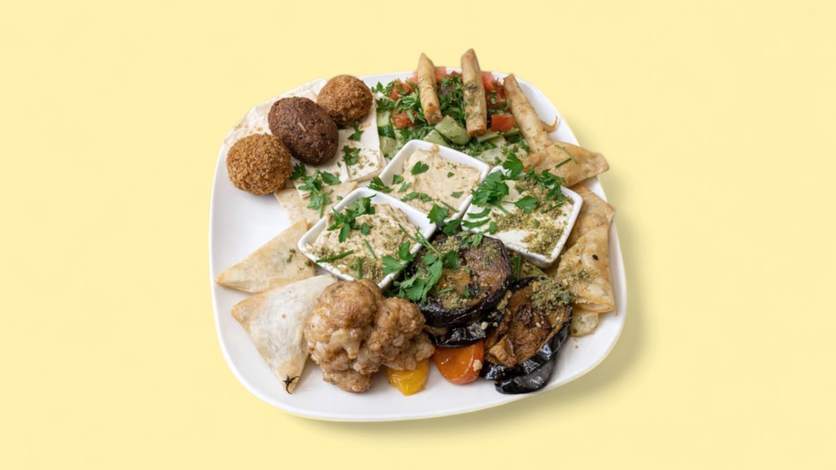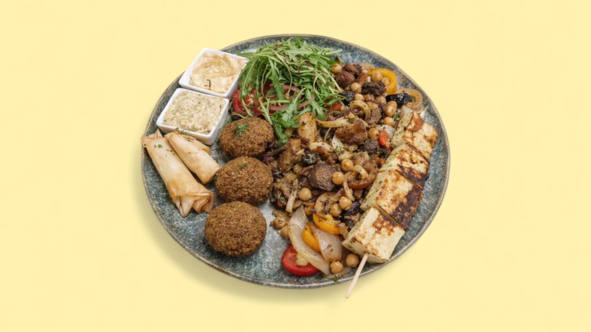 3x Falafel 3x Blätterteigröllchen 1x Halloumi-Spieß gegrilltes Gemüse, dazu Salat, 3 Dips und einer Beilage deiner Wahl