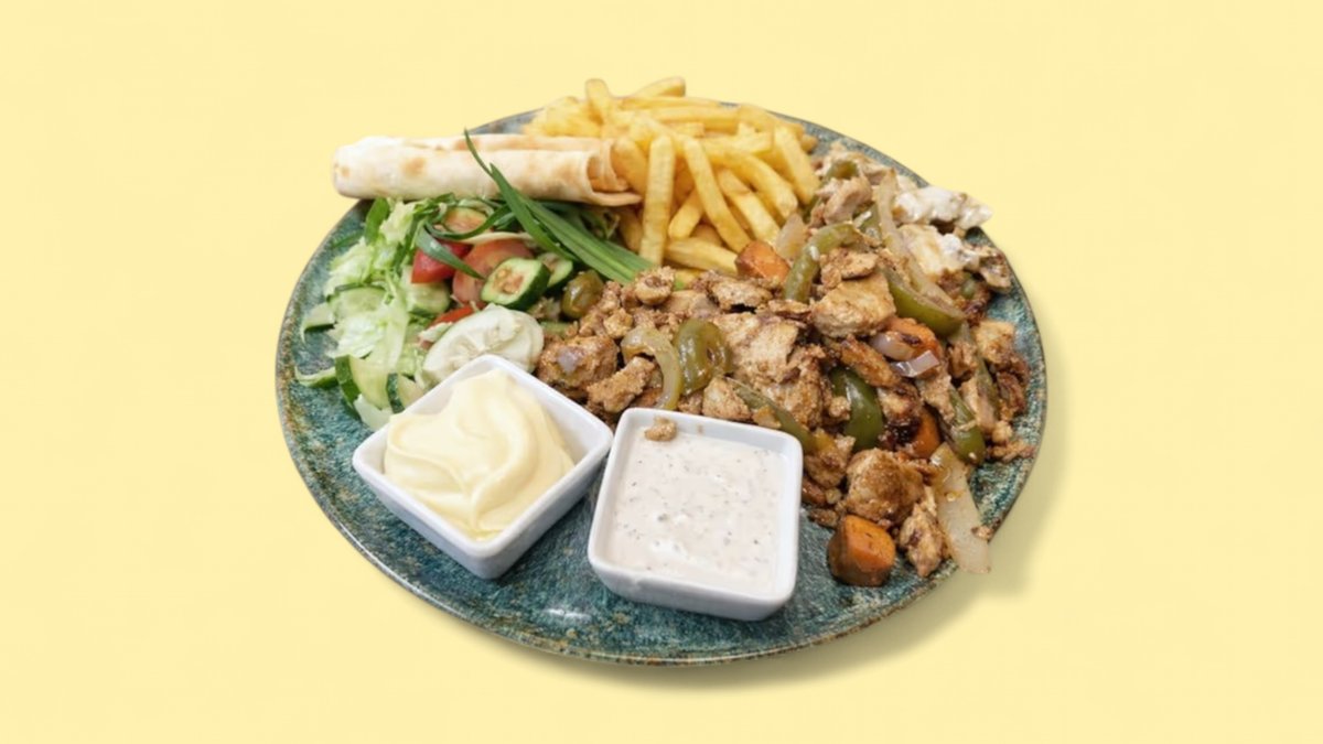 mit gegrilltem Hähnchenfleisch, Rindfleischstreifen, Fritten und Beirut Soße