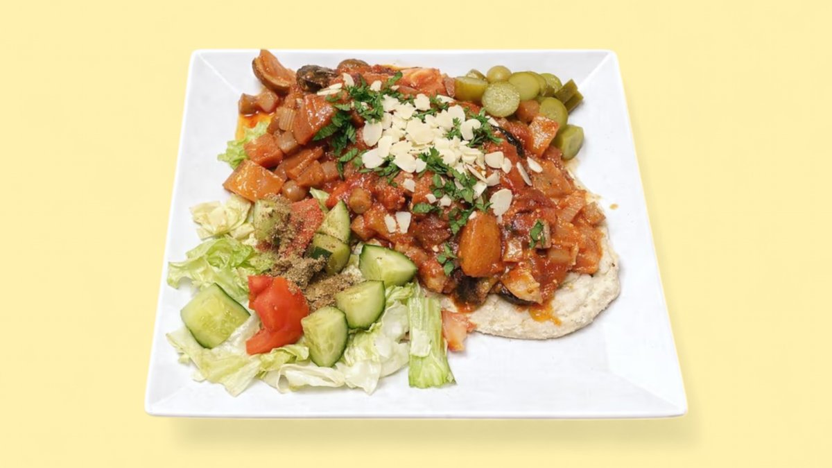 gekochte Auberginen, Kartoffeln, Zwiebeln und Kichererbsen, verfeinert mit frischer Petersilie, Mandeln, dazu Salat