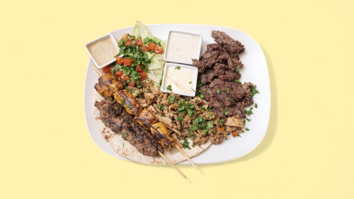 für 2 Personen mit 2x Schisch Tawuk-Spieße, 2x Kafta-Spieße, Schawarma Djej und Lahme, dazu Salat, Hummus, Baba Ghanoush Knoblauchcreme, gegrillten Tomaten und Zwiebeln