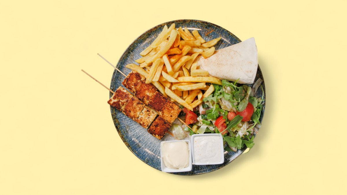 alle Gerichte werden mit Brot serviert („86. Falafel-Teller” wird ohne Brot serviert)