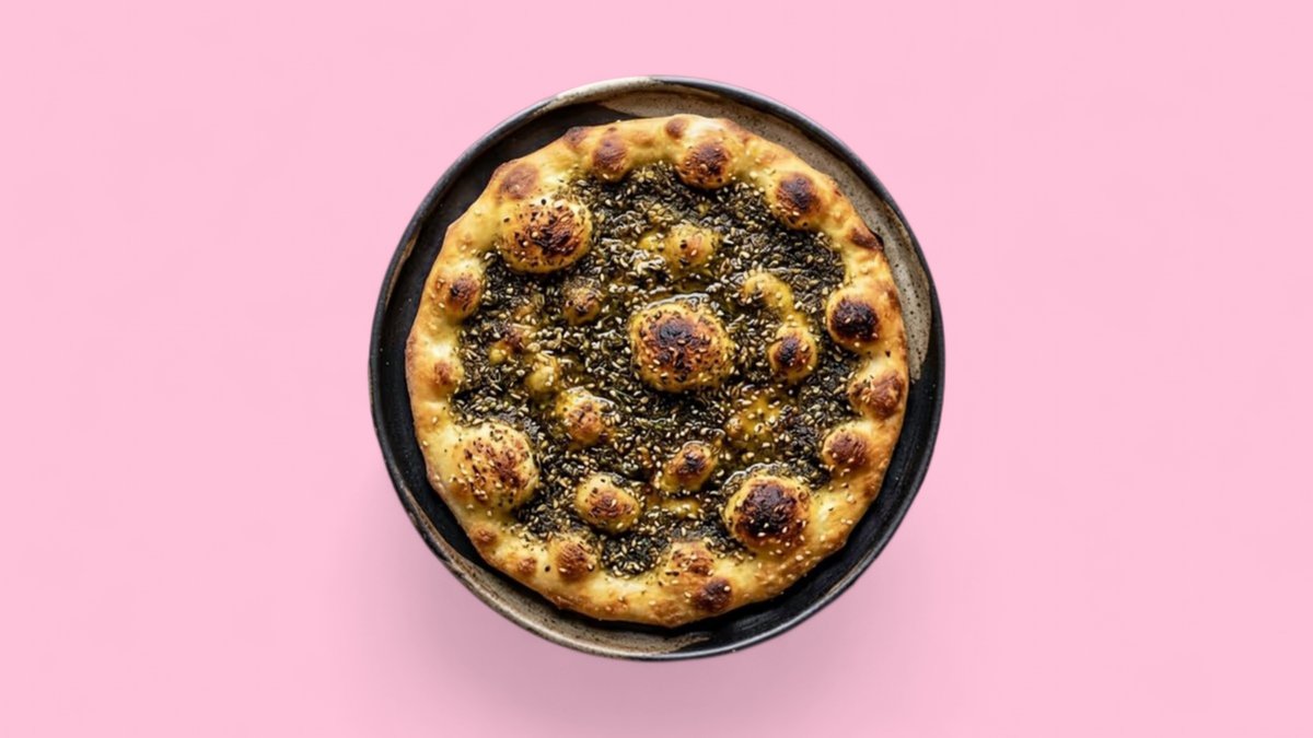 frisch gebacken, mit einer köstlichen Mischung aus aromatischem Zatar (Thymian und Sesam) und hochwertigem Olivenöl