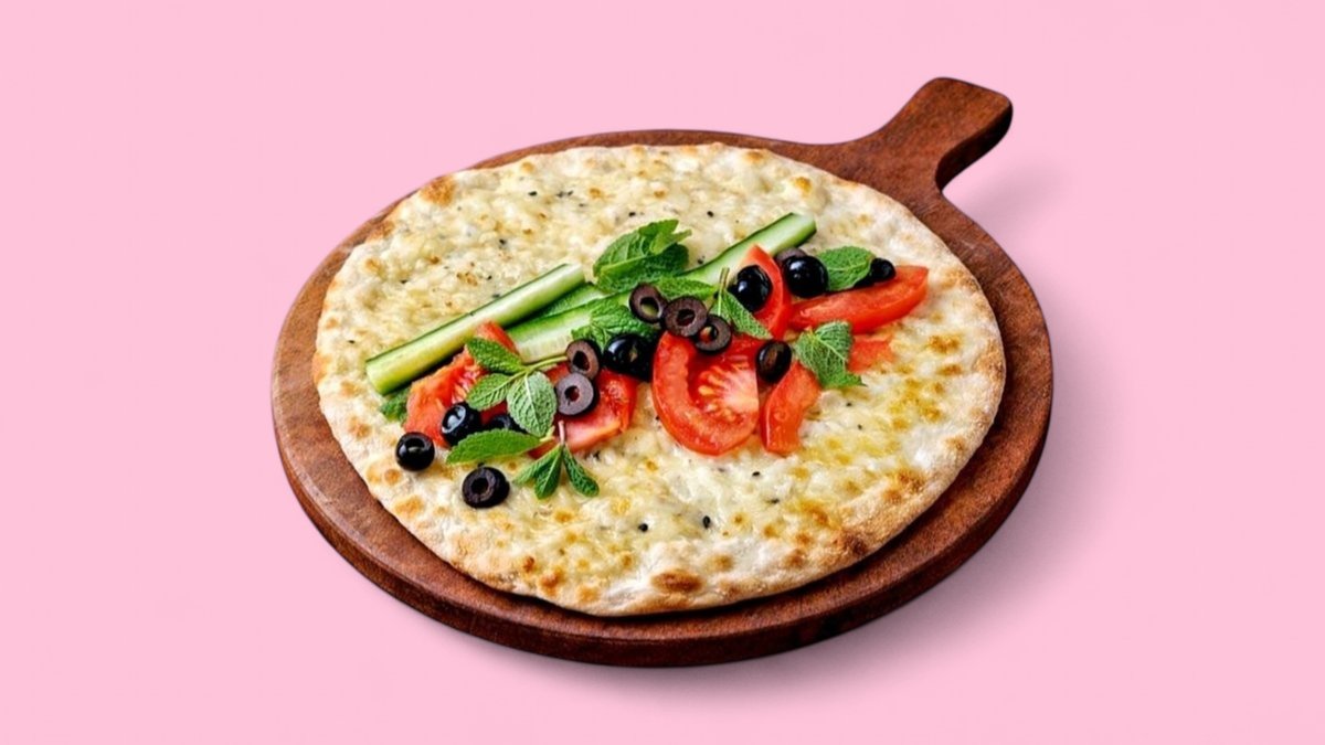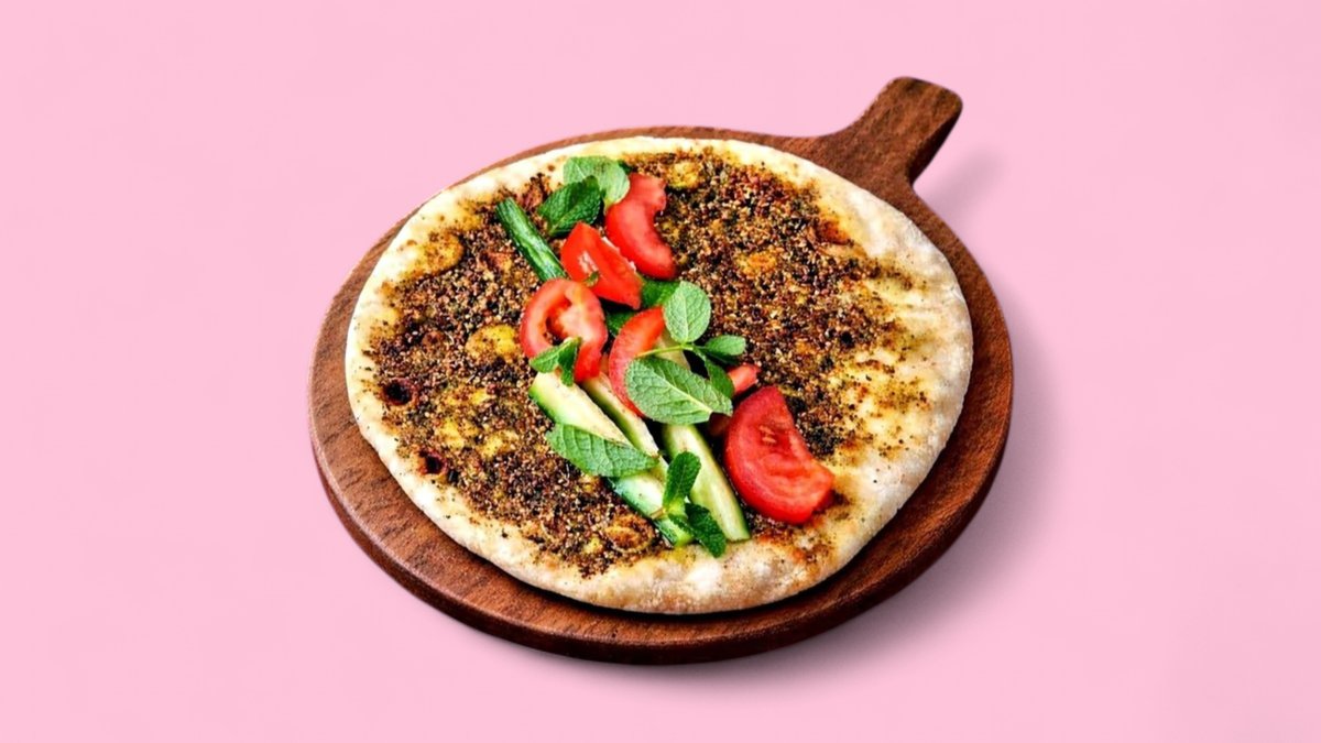 mit Zatar, zubereitet auf weichem, am Rand knusprigem Teig, belegt mit aromatischem Thymian und Olivenöl, mit frischem Tomaten, Gurken, schwarzen Oliven und Minzblättern