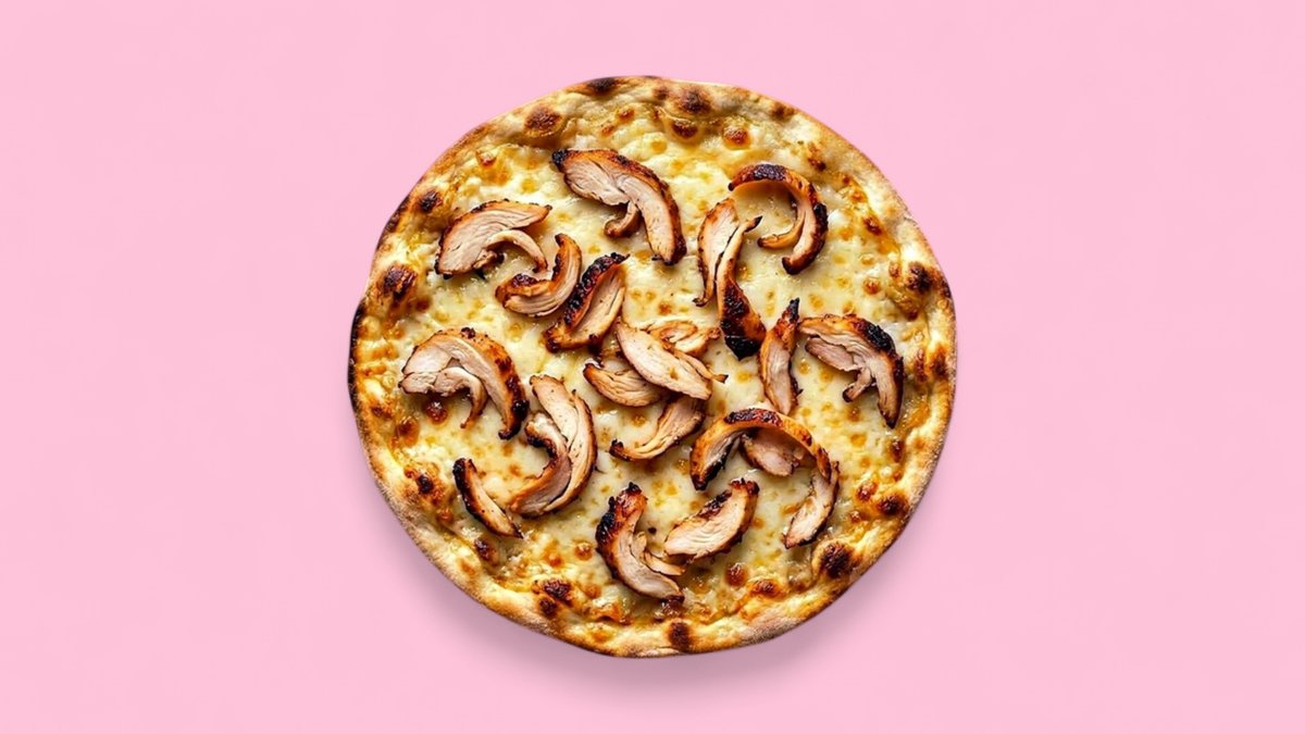 Knuspriger Pizzateig belegt mit saftigem Hähnchen, frischen Zwiebeln und zart schmelzendem Gouda auf aromatischer Tomatensauce