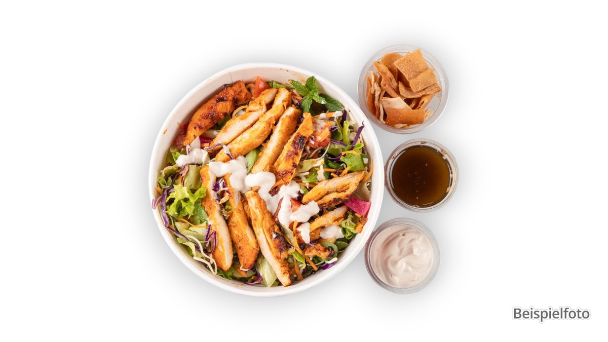 alle Gerichte werden mit Hähnchen, einer Beilage und einem Salat serviert