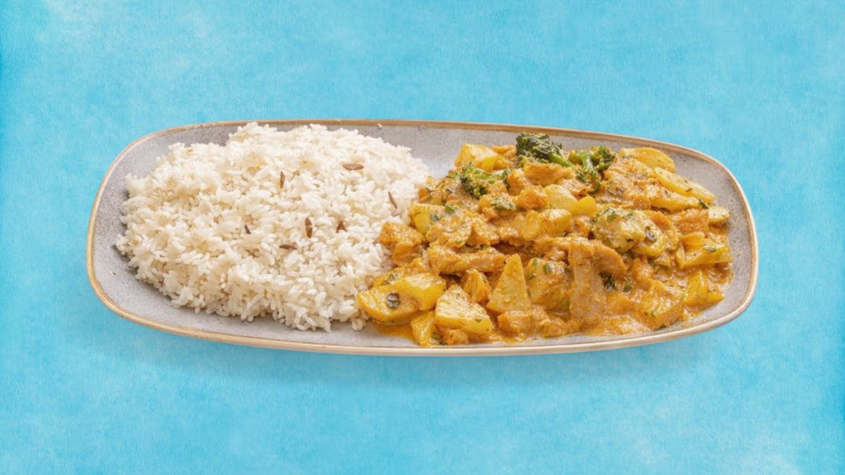 Hähnchenbruststreifen mit Brokkoli, Champignons, Ananas, Currysoße und einer Beilage deiner Wahl