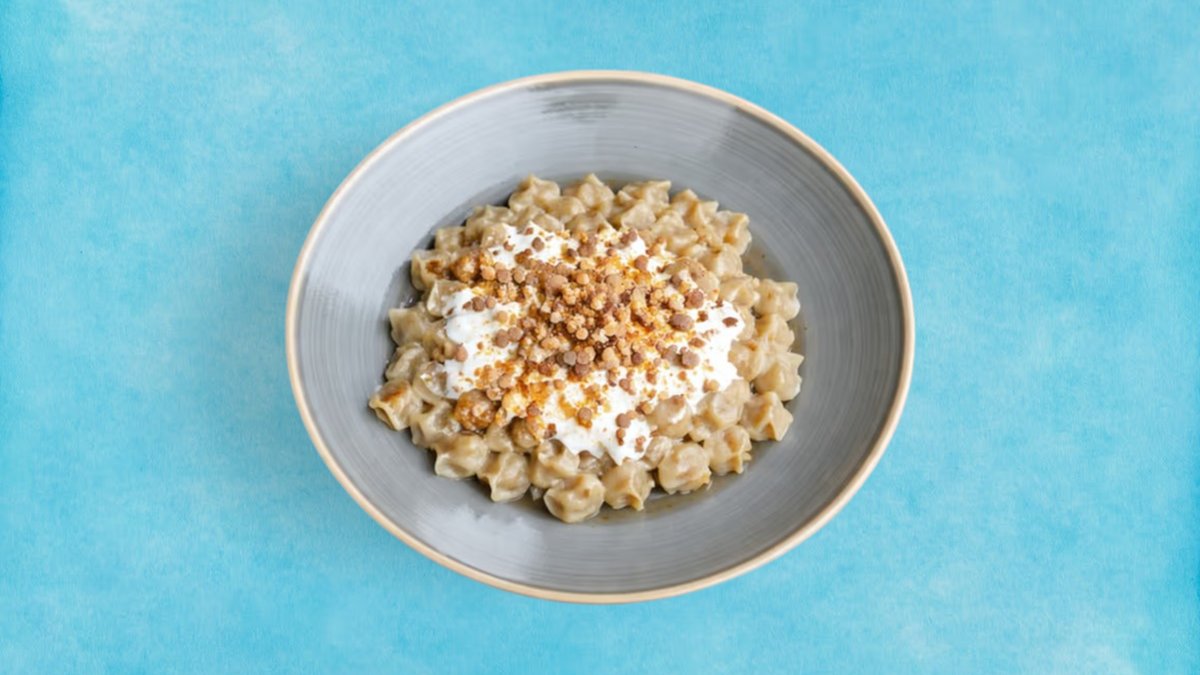 hausgemachte Tortellini gefüllt mit Rinderhackfleisch, mit Joghurt-Knoblauchsoße und Paprika-Buttersoße