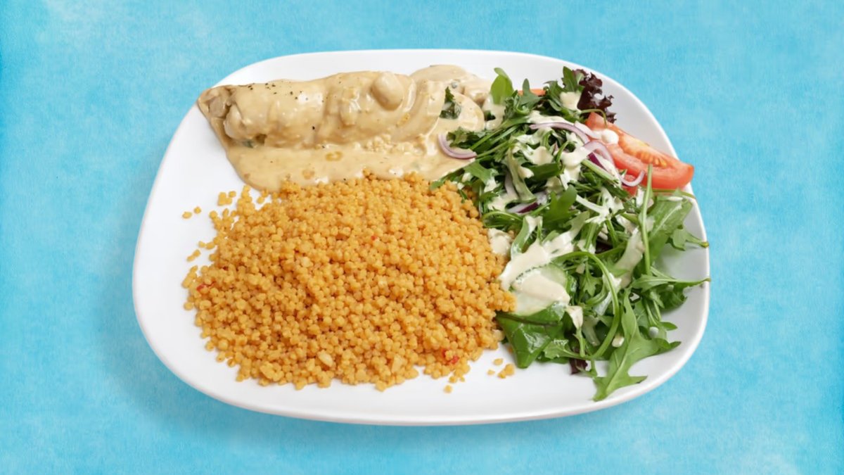 Hähnchenbruststreifen mit Champignons, Paprika, Zwiebeln, Sahne-Sojasoße und einer Beilage deiner Wahl