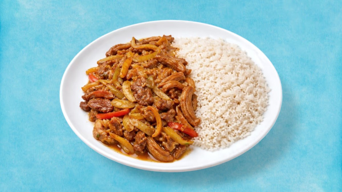 Lammgeschnetzeltes mit Auberginen, Zucchini, Zwiebeln, Peperoni, Tomatensoße und einer Beilage deiner Wahl