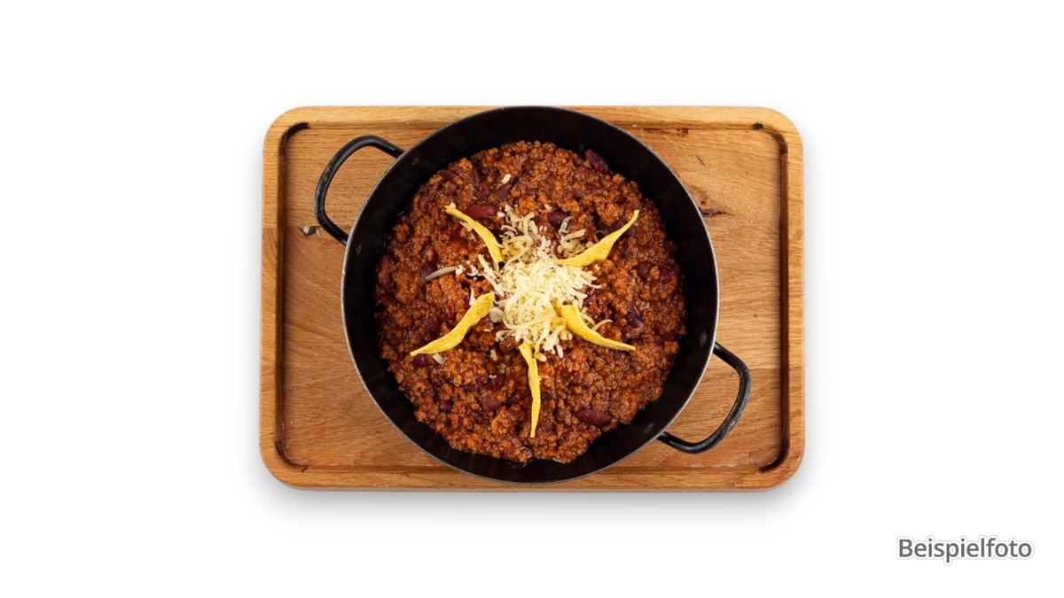 kräftiges Chili con Carne mit Bohnen, Mais und scharfen Chilis, überbacken mit aromatischem Gouda