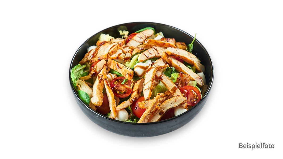 saftig gegrillte Hähnchenbruststreifen mit Paprika, Champignons, Zwiebeln, Mais, Gouda, Eisbergsalat und feiner Mayonnaise