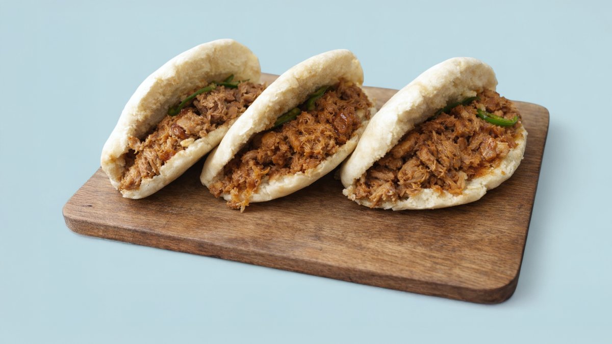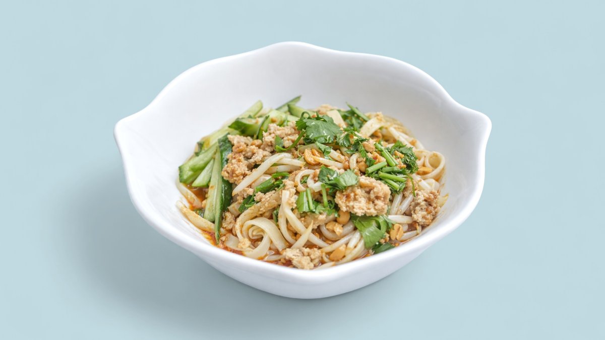 handgezogene breite Biangbiang-Nudeln gedünstet mit mariniertem Hühnerfleisch, Haussoße auf Sojabasis, schwarzem Essig, Knoblauch und Chili-Öl