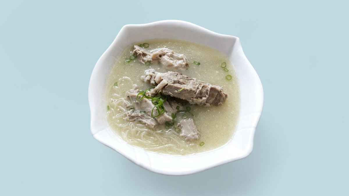 Lammfleisch am Knochen in Brühe mit Glasnudeln, Koriander, Lauchzwiebeln, Pfeffer, Paprikagewürz, chinesischen Barbecue-Gewürzen und hausgemachtem Brot