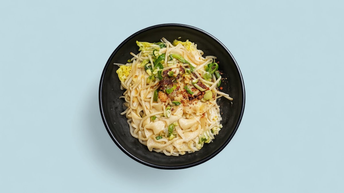 handgezogene breite Biangbiang-Nudeln mit Sojasprossen, Spitzkohl, Pak Choi, Haussoße auf Sojabasis, schwarzem Essig, Knoblauch und Chili-Öl