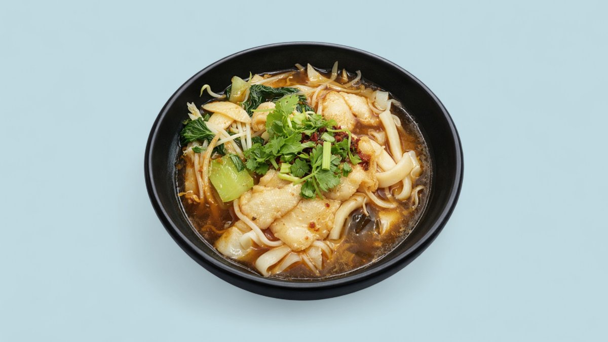 scharf handgezogene breite Biangbiang-Nudeln mit Sojasprossen, Spitzkohl, Pak Choi, scharfer Sichuan Soße und Fisch