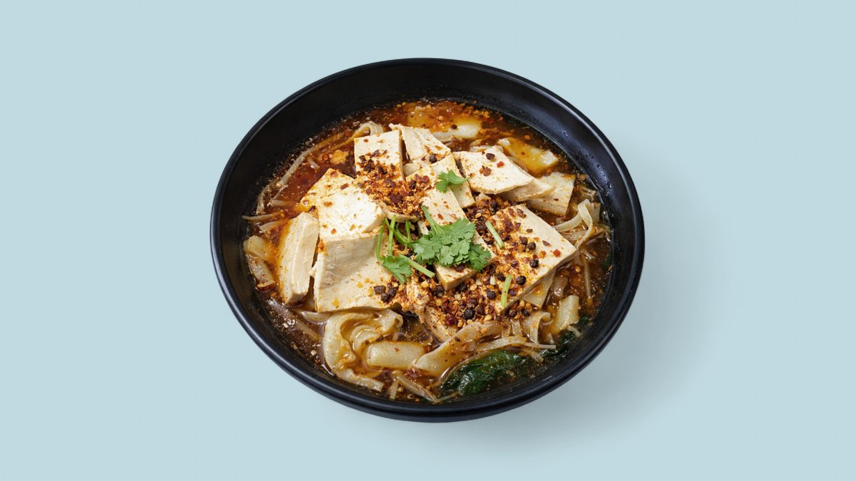 scharf handgezogene breite Biangbiang-Nudeln mit Sojasprossen, Spitzkohl, Pak Choi, scharfer Sichuan Soße und Tofu