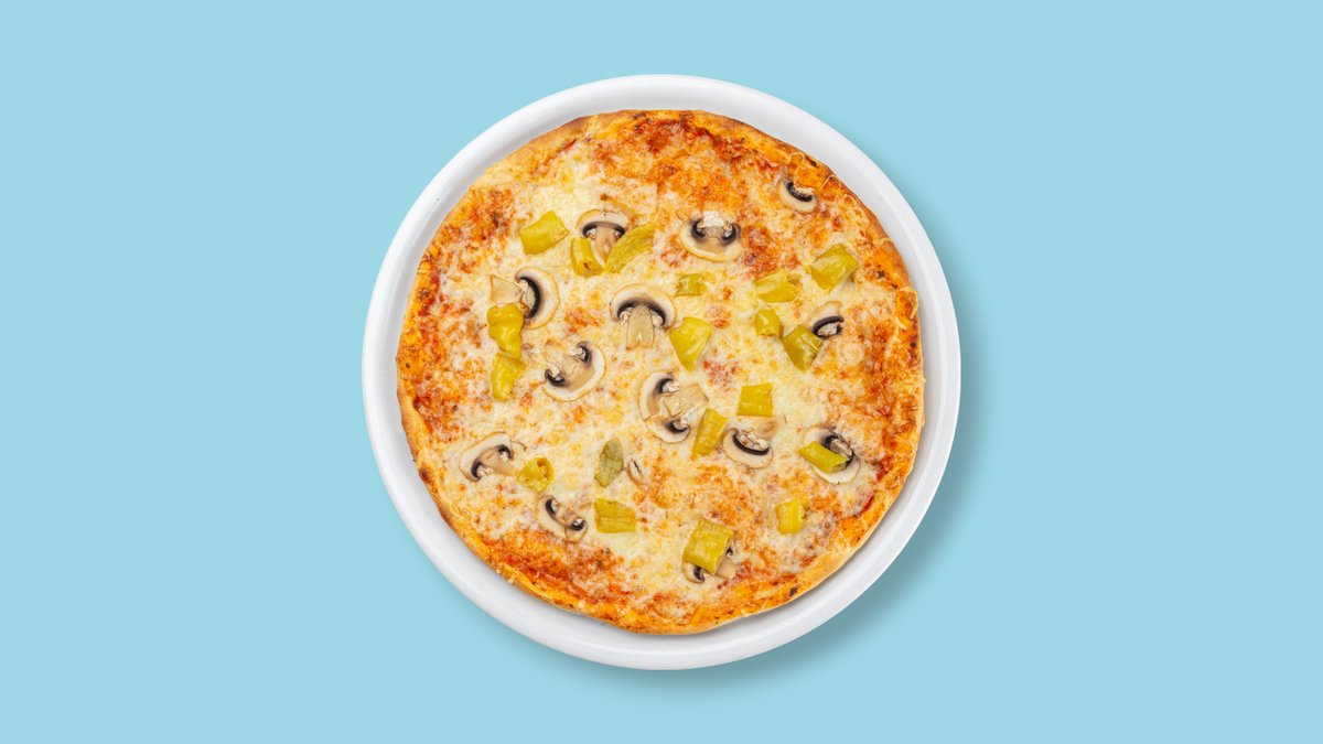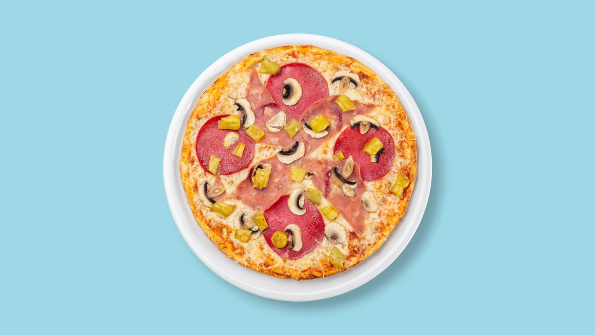 mit Salami vom Pute, Schinken vom Pute, Champignons, Peperoni und Zwiebeln