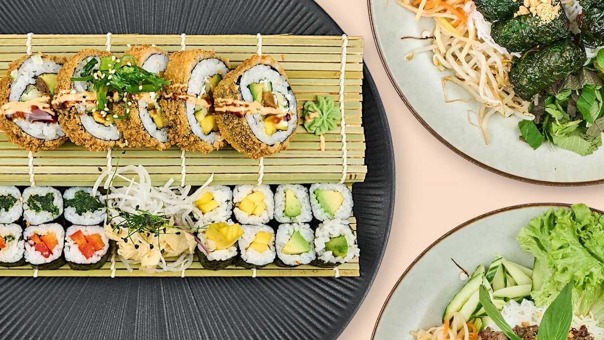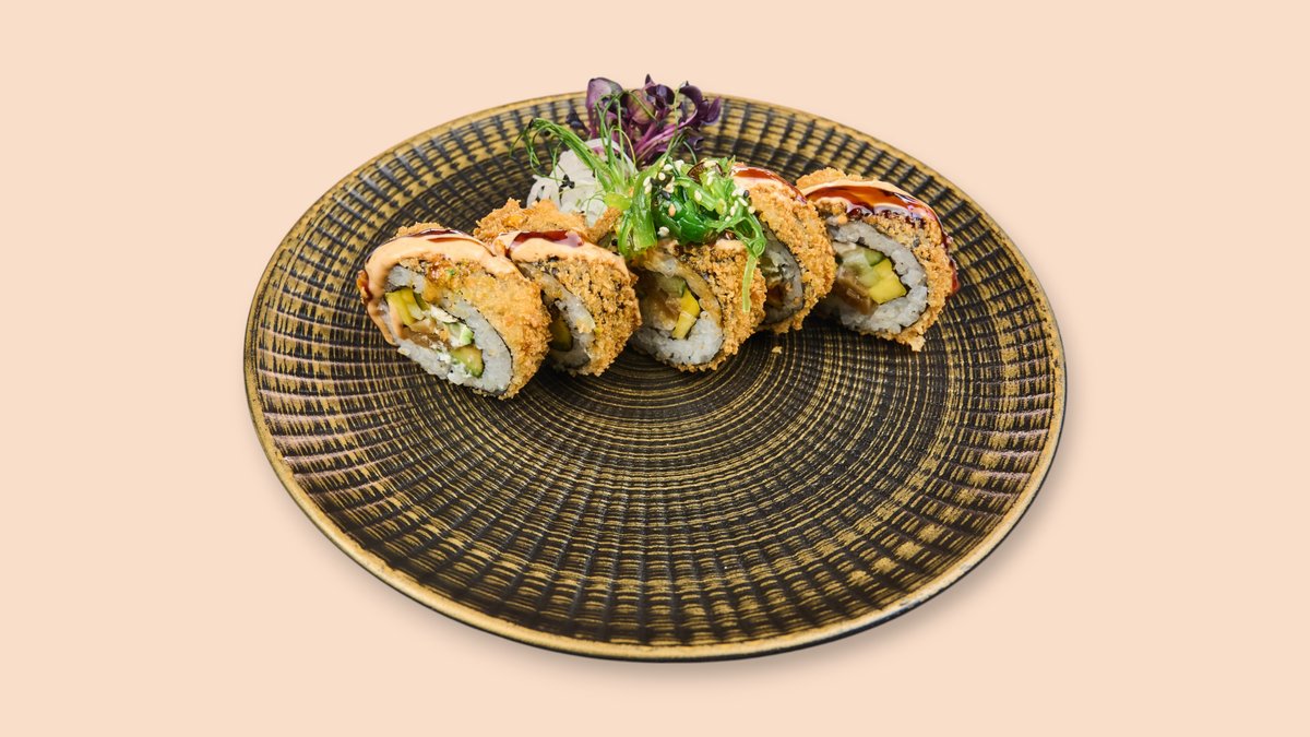 mit Avocado, Gurken, eingelegtem Kürbis, Mango und Frischkäse in knusprigem Tempura-Mantel