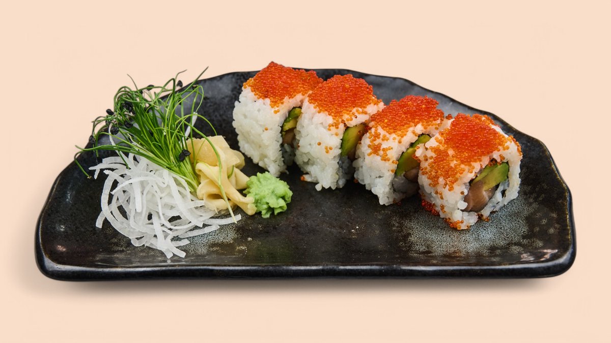 mit gebratenem Lachshaut, Avocado und Frischkäse, ummantelt mit gekochten Garnelen, Daikon-Kresse, Tobiko und Reispapier