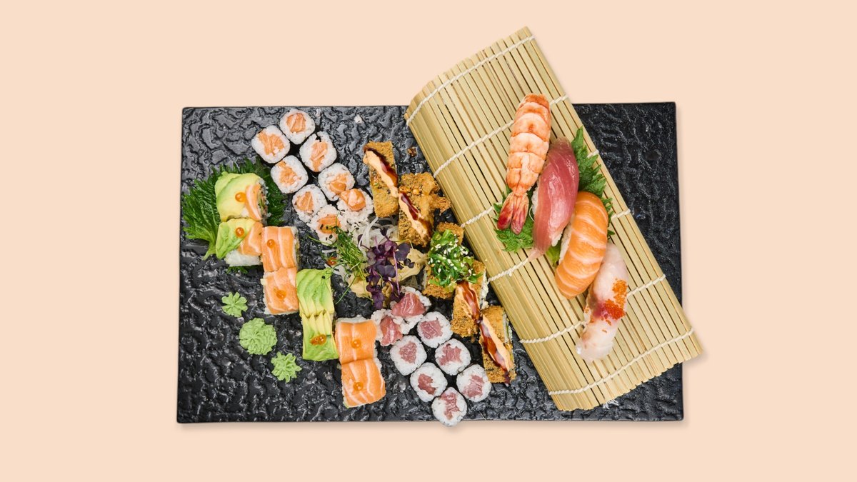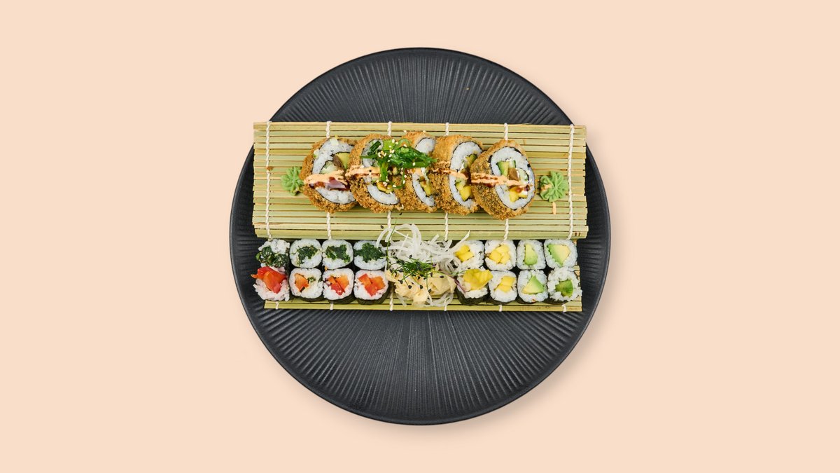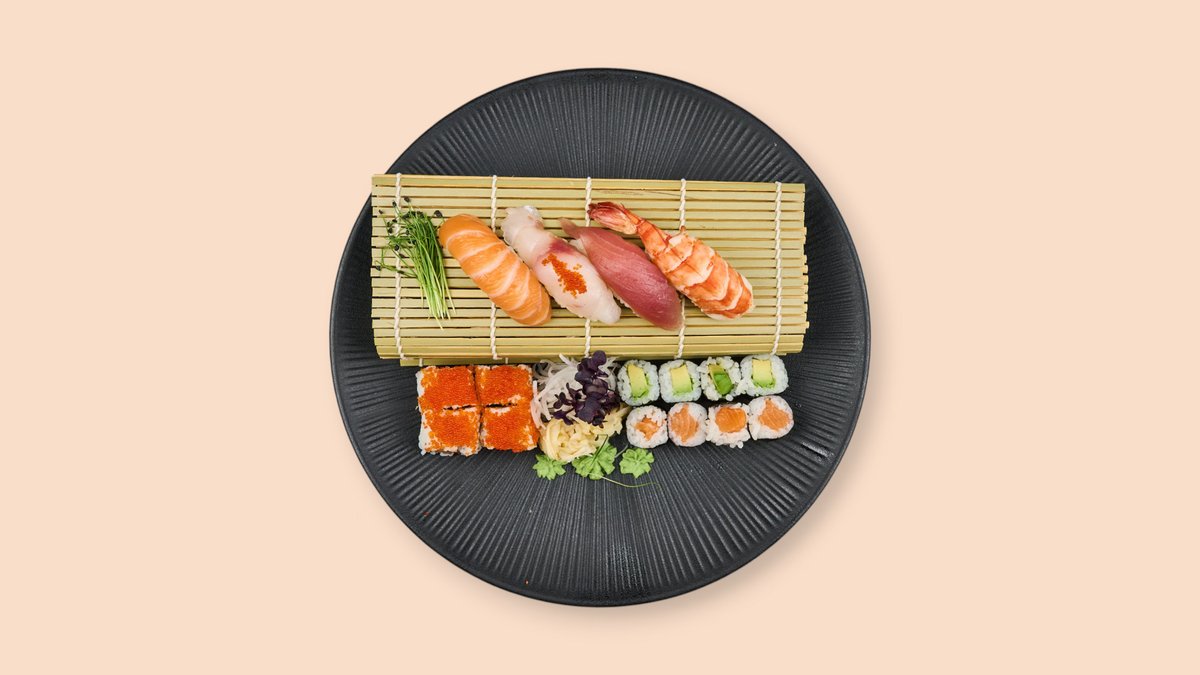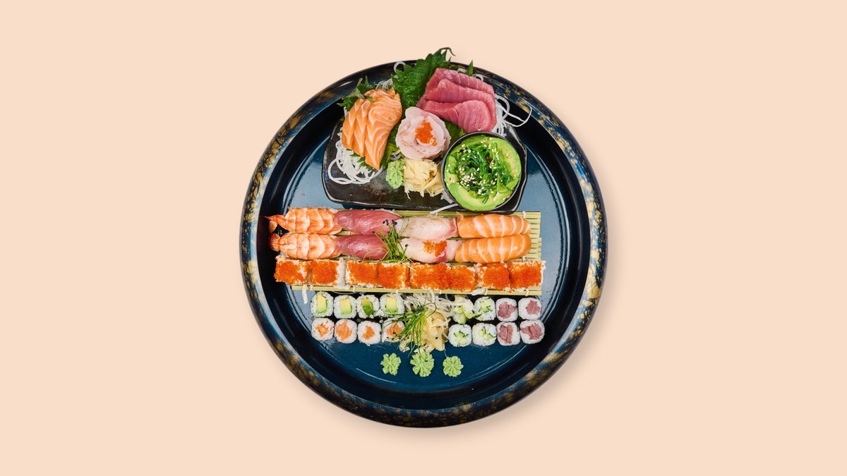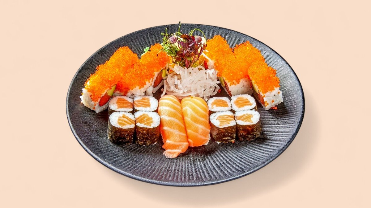für 2-3 Personen 8x California Maki mit Tobiko 4x Lachs Maki 4x Thunfisch Maki 4x Avocado Maki 4x Gurken Maki kleines gemischtes Sashimi 2x Lachs Nigiri 2x Thunfisch Nigiri 2x Garnelen Nigiri 2x Wolfsbarsch Nigiri
