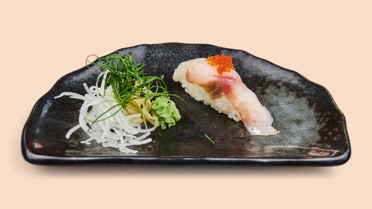 4x California Maki mit Tobiko 4x Lachs Maki 4x Avocado Maki 1x Lachs Nigiri 1x Thunfisch Nigiri 1x Wolfsbarsch Nigiri 1x Garnelen Nigiri