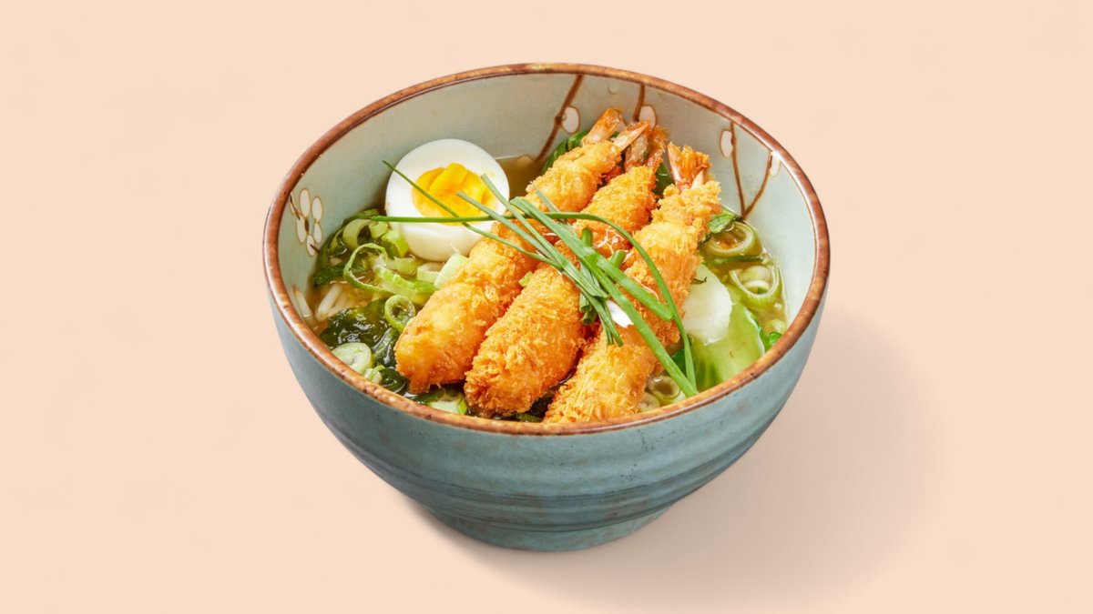 Weizennudelsuppe auf Miso-Basis mit Pakchoi, Eiern, Seetang und Tempura-Garnelen