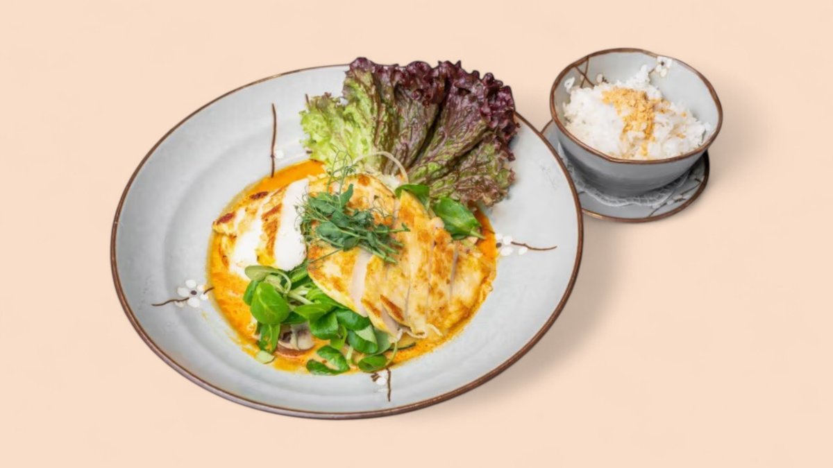 leicht scharf gegrilltes Hähnchenbrustfilet in cremiger Ananas-Kokos-Currysoße mit buntem Gemüse und gerösteten Erdnüssen