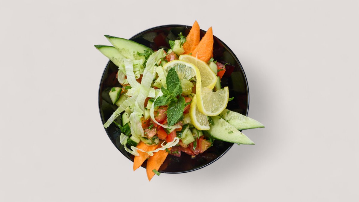 mit Tahina, Joghurt, Hummus, Gurken, Rüben, Essiggurken, Tomaten und Salat