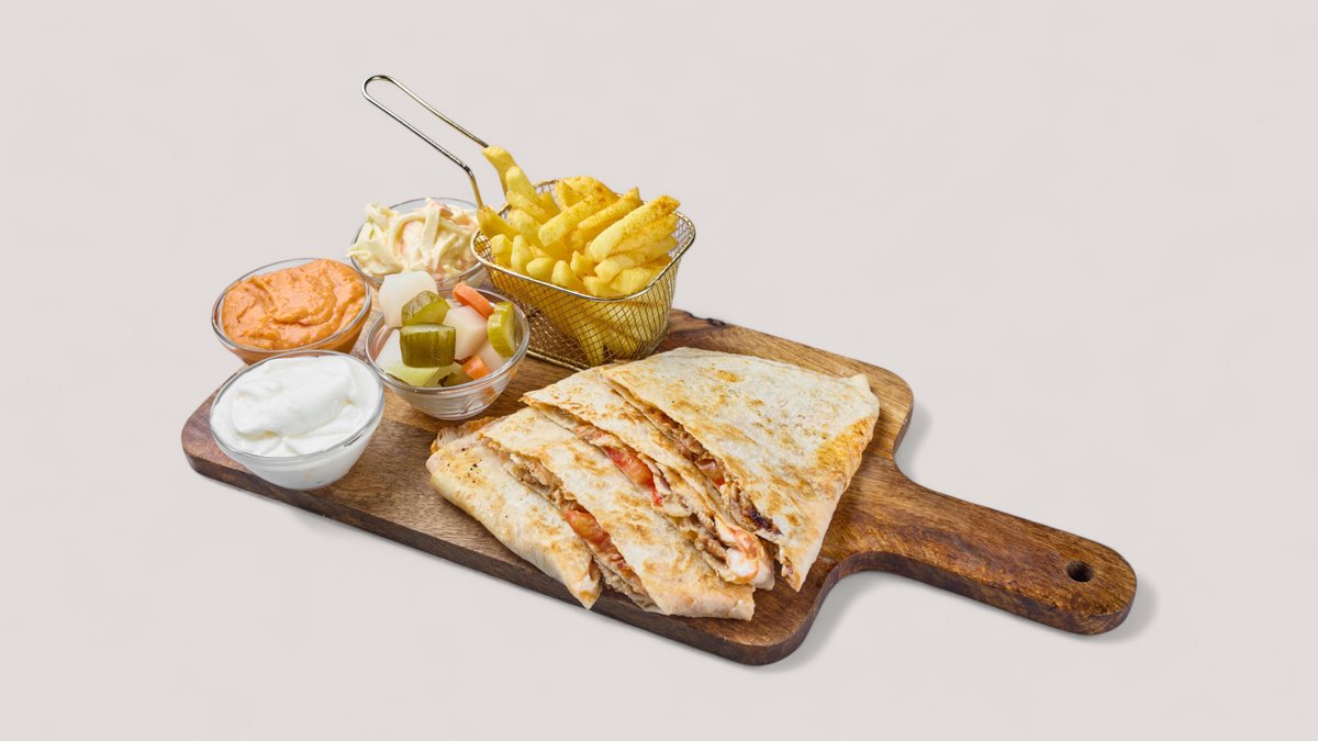 mit Hummus, Mutabbal, Petersilie, Zwiebeln, Tomaten, Soße, Granatapfelsirup, Rote Beete, eingelegten Gurken, Gemüse und einer Beilage deiner Wahl