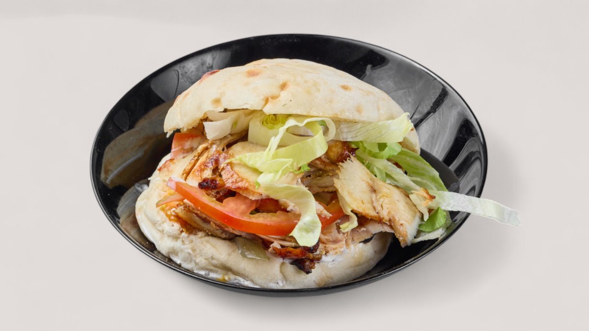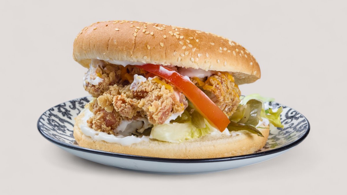 mit knusprigem Hähnchen, Knoblauchsoße, Krautsalat, Mayonnaise und Essiggurken
