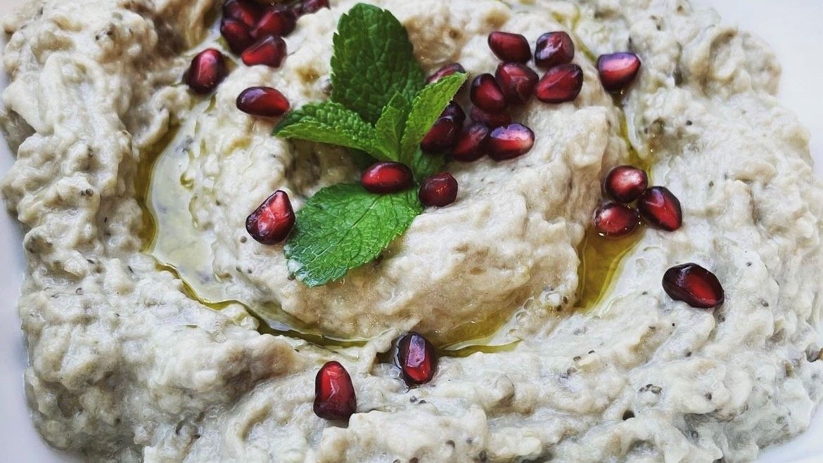 mit gegrillten Auberginen, Joghurt, Tahini und Granatapfelsirup