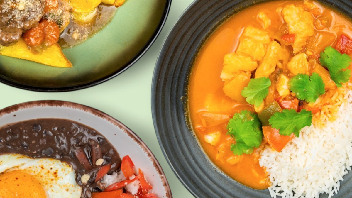 brasilianischer Fischeintopf mit Kokosmilch, Tomaten, Paprika, Zwiebeln, Koriander, Ingwer und Reis