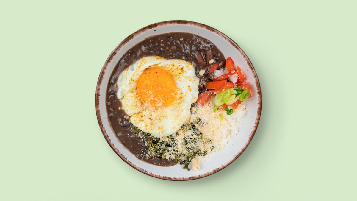 Bowl auf brasilianische Art mit schwarzen Bohnen, Schweinefleisch, frischer Bratwurst, Reis und Farofa (Maniok)-Gewürz